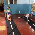 Na semana do trânsito foi realizado na escola Leonor Mendes Barros um pequeno percurso simulando uma cidade, com algumas placas de trânsito e um carro personalizado de papelão os alunos percorriam pela cidade observando as sinalizações.