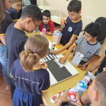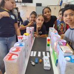 Durante a montagem da maquete, toda a turma participou com muito entusiasmo e colaboração. O professor orientou o grupo sobre como organizar os espaços e distribuir os materiais recicláveis que seriam utilizados. Usamos caixas de leite, garrafas PET, rolos de papel, tampinhas e pedaços de papelão para construir os diferentes elementos da maquete.