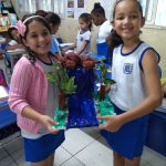 Para finalizar, fizemos as borboletas de material reciclável e levaram as mudinhas de plantas.