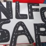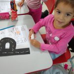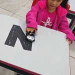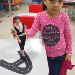 Foi proposto para as crianças a elaboração de pistas com traçados de letras, utilizando principalmente a inicial de seu nome, Entreguei as letras já desenhadas em papel cartão preto e eles desenharam, os traços da pista com cola colorida branca. Depois brincaram com carrinhos e bonecos, fazendo o percurso em volta das letras.