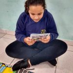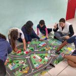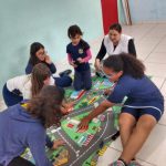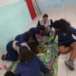 Leitura da revista Zé Quest Educação para o Trânsito e Meio Ambiente, posteriormente as crianças tiveram a oportunidade de explorar o tapete temático com o objetivo de sensibiliza-los atitude solidária frente a situações ocorridas no trânsito.