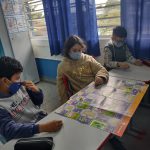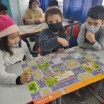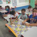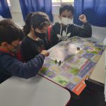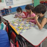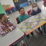 Para finalizar, as crianças brincaram com o Jogo da trilha, em trios, onde tiveram que confeccionar seus carrinhos, ler as regras do jogo e depois jogar. Nesse Jogo da trilha, os alunos tinham que sair de suas casas (início do jogo) e transitar com seus carrinhos pelas casas do tabuleiro, seguindo as regras corretas para um trânsito seguro, até chegar na escola (fim do jogo).