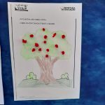 Em seguida trabalhamos a coordenação motora fina, rasgando e amassando papel crepom para fazer bolinhas e colar em nossa árvore. Essas bolinhas significaram os frutos da árvore.