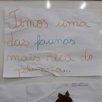 Através da conversação com alunos do 4º ano A, leitura de textos informativos, pesquisas, observações, relatos de pessoas mais velhas, foram desenvolvidas atividades de conscientização da importância de preservar espécies de animais ameaçados de extinção. No término das atividades, cada aluno confeccionou seu cartaz com a montagem de um animal em extinção utilizando folhas de árvores e gravetos para expor no mural da escola.