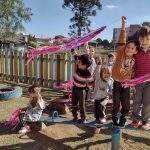 O brinquedo foi feito com tiras de papel crepom e barbante para amarrar as pontas.  Brincaram correndo pelo espaço da escola, percebendo que o vento balança as tiras de papel.