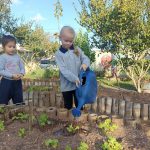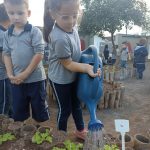 A turma do 2º período D, foi até a horta verificar como estava a plantação da alface que elas fizeram anteriormente. Constataram o seu crescimento e em seguida, regaram e tiraram os “matinhos” em volta.