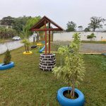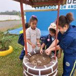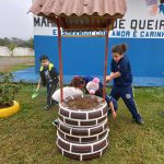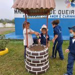 A escola para dar o exemplo de reutilização, de defesa ao meio ambiente e de cidadania, foi atrás de pneus que estavam infelizmente jogados em vias públicas e no meio ambiente, trouxe para nossa escola e pintamos, transformamos esses pneus, fizemos com eles um poço decorativo, usamos para colocar plantas e flores para deixar o nosso jardim lindo.