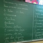 Na aula de Língua Portuguesa, os alunos copiaram o poema “O menino e a árvore”, na qual falava de cuidar das árvores como fosse  nosso melhor amigo. Eles aprenderam também que não é certo ficar arrancando folhas, galhos e destruindo nossas árvores.