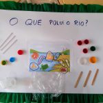 Desenvolvimento: Através da roda de conversa, explicamos sobre a importância de um rio saudável na natureza e o que impacta também em nosso dia a dia. Mostramos algumas imagens de rios poluídos e os objetos mais encontrados ali. Conversamos: Como os rios ficam sujos? Quem suja o rio? Quais objetos são frequentemente achados nos rios, mas que não fazem parte deste ambiente?