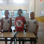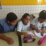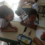 Divididos em pequenos grupos, os alunos confeccionaram as placas observadas que servirão de fantasia para apresentação teatral.