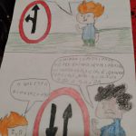 A turma da D. Márcia, despertaram um grande gosto por estudar as placas. As crianças dizem que logo logo é a hora de se habilitarem, para adquirirem a CNH, então após a leitura de uma página da Revistinha história em quadrinhos, eles tiraram par ou ímpar entre si, para ver quais placas eles iriam desenhar. E a placa que ganhou foi a mão dupla, também siga em frente ou vire a esquerda.