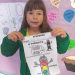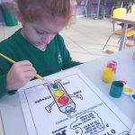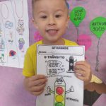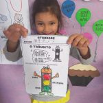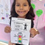 A partir da musica “o trânsito” de Elias Becky disponivel no Youtube, a professora elaborou uma atividade com tinta guache onde as crianças deveriam pintar o semaforo com as cores correspondentes: VERMELHO – PARE. AMARELO – ATENÇÃO e VERDE – SIGA EM FRENTE.