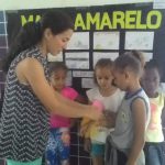Finalizando, amarrou uma fitinha amarela no pulso dos alunos, para eles lembrarem de comentar com os pais sobre o que aprenderam sobre o trânsito. Depois distribuiu para eles panfletos educativos, explicando sobre a importância da Campanha MAIO AMARELO.
