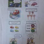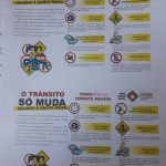 Em seguida, ela distribuiu para os alunos o panfleto educativo “O TRÂNSITO SÓ MUDA QUANDO A GENTE MUDA”. Fez a leitura das imagens das placas de sinalização com os alunos.