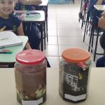 Durante a aula os alunos receberam uma tabela sobre o tempo de descarte de cada tipo de material se ele for jogado na natureza, eles aprenderam sobre a importância de fazer o descarte correto do lixo, fazendo a reciclagem, enviando os rejeitos para o caminhão da coleta e usando os materiais orgânicos para fertilizar o solo. Na aula anterior a professora havia pedido para que a turma levasse vários tipos de objetos e então foram preparados dois potes com terra, em um foi colocado materiais reciclados e no outro materiais orgânicos para que sejam observados durante o ano letivo e abertos apenas nos últimos dias de aula para que assim percebam que os orgânicos irão desaparecer rapidamente e o pote com os materiais reciclados estará intacto o que traria impacto negativo se estivesse na natureza.