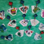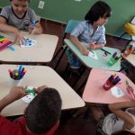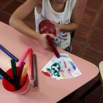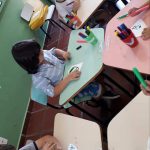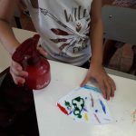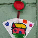 Utilizando o filtro de papel professora fez com que as crianças desenhar com canetinha e depois borrifando álcool fizeram lindo vaso para uma flor de reciclagem.