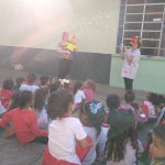 Nessa atividade as professoras do pré II elaboraram um teatro, onde o personagem dramatizou atitudes incorretas em relação ao meio ambiente e após sofrer as consequências dessas atitudes e comportamentos incorretos, refez tudo com respeito e consciência de uma vida melhor e saudável.