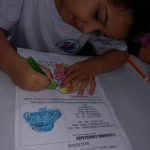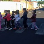 Conversamos com os pequenos explicando desde o significado da palavra pedestre, sobre a placa de fronte a escola, e a pintura “listrada no chão”.