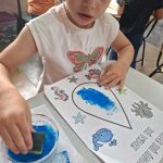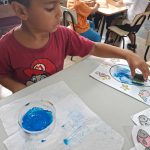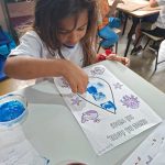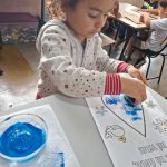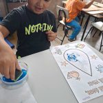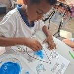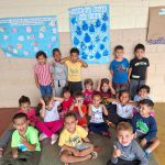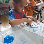 A professora Graziela trabalhou com os alunos a importância da água através de vídeos lúdicos, músicas e gestos. Os alunos pintaram as gotinhas de água e formaram um lindo cartaz, que ao olhar nos inspira a lembrar numa linda tarde chuvosa. A professora utilizou tinta guache e bucha para essa atividade.