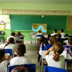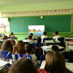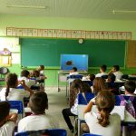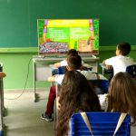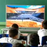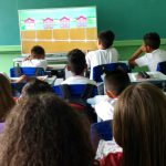 Os alunos do 5º ano assistindo vídeo sobre saneamento básico