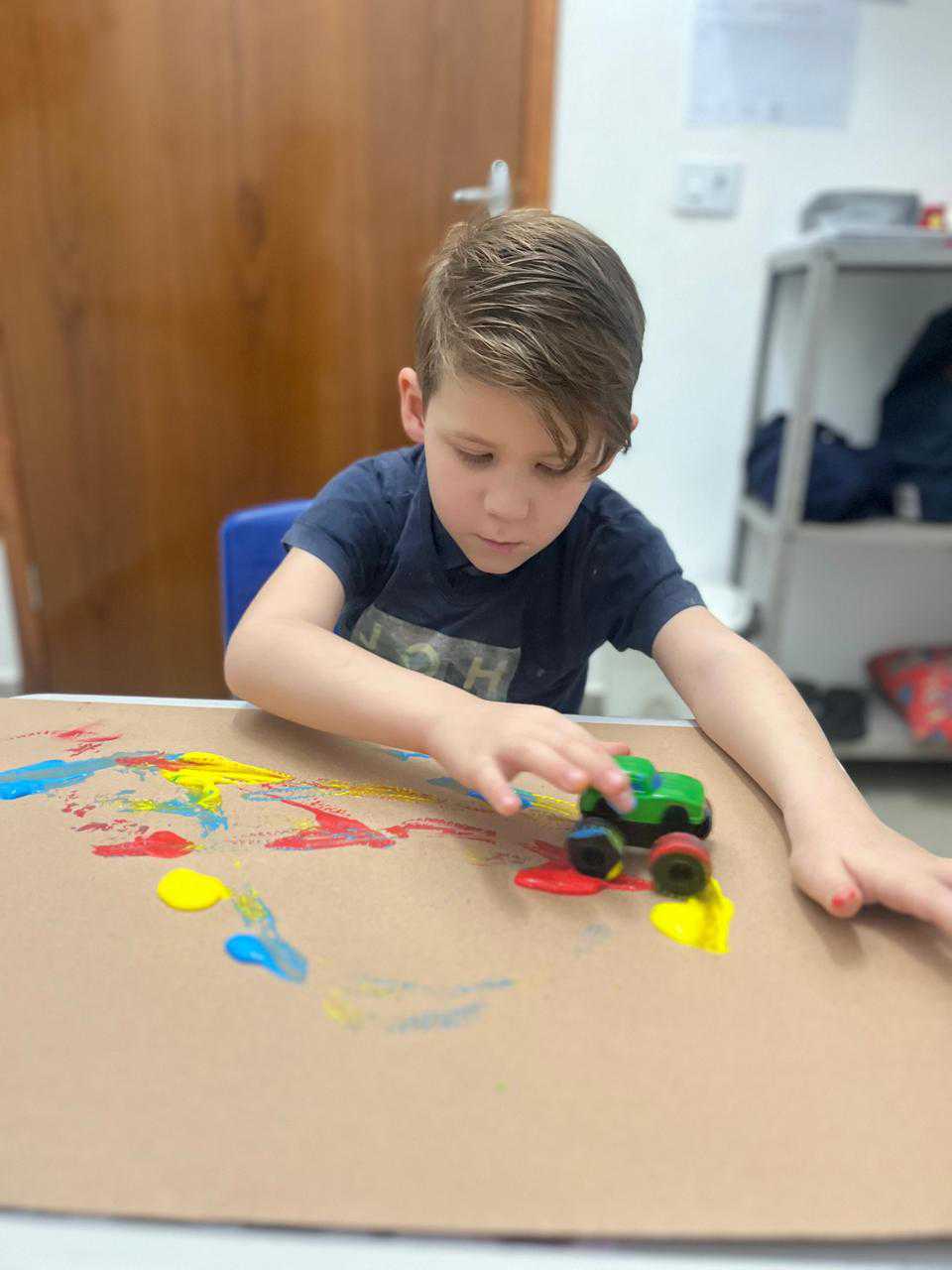 É uma atividade lúdica e educativa, em vez de pincéis, as crianças usam carrinhos de brinquedo molhados na tinta para criar “estradas” em cartolinas. Estimulando a coordenação motora, a percepção visual e a exploração de diferentes texturas e cores.