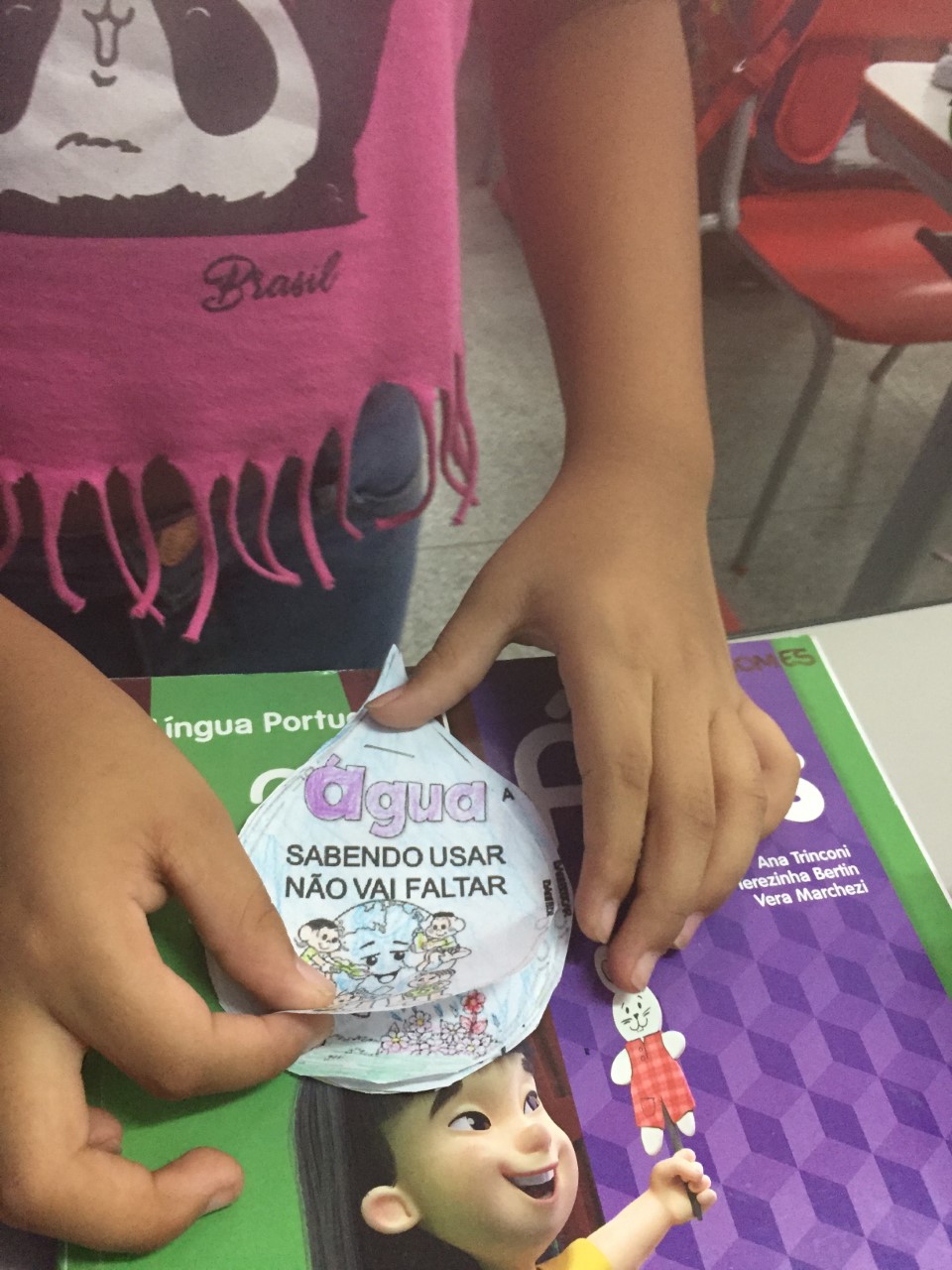 Leitura e interpretação dos textos sobre como devemos agir para economizar água. Após uma roda de conversa sobre as vivências de alguns alunos com cuidados com a água, pintaram as ilustrações das ações e formaram o livro da água.