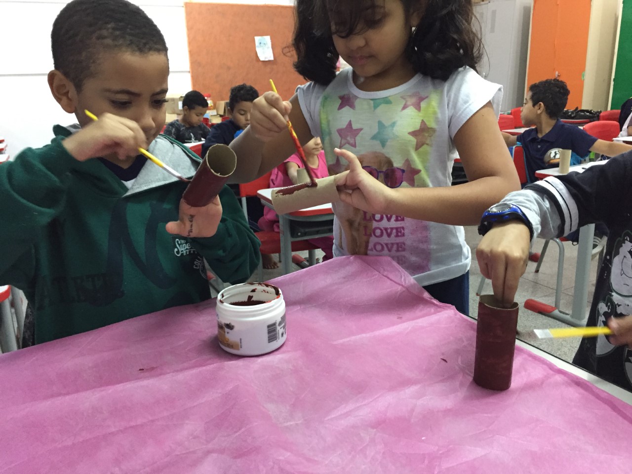 Os alunos confeccionaram uma pequena árvore reutilizando rolo de papel higiênico e folhas caídas das árvores. Pintaram os rolos com tinta guache, enquanto secavam pintaram as copas e colaram as folhas. Ao terminarem de montar suas árvores fizeram a exposição.