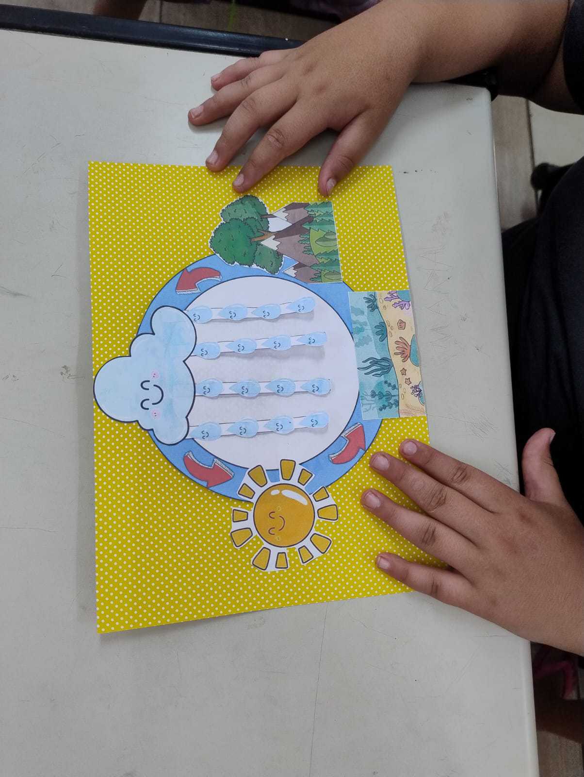 A professora Gisele trabalhou com os alunos o ciclo da água. Os alunos assistiram vídeos sobre o assunto e debateram sobre a importância da água na nosso dia a dia. O trabalho finalizou com a pintura a dedo com guache …