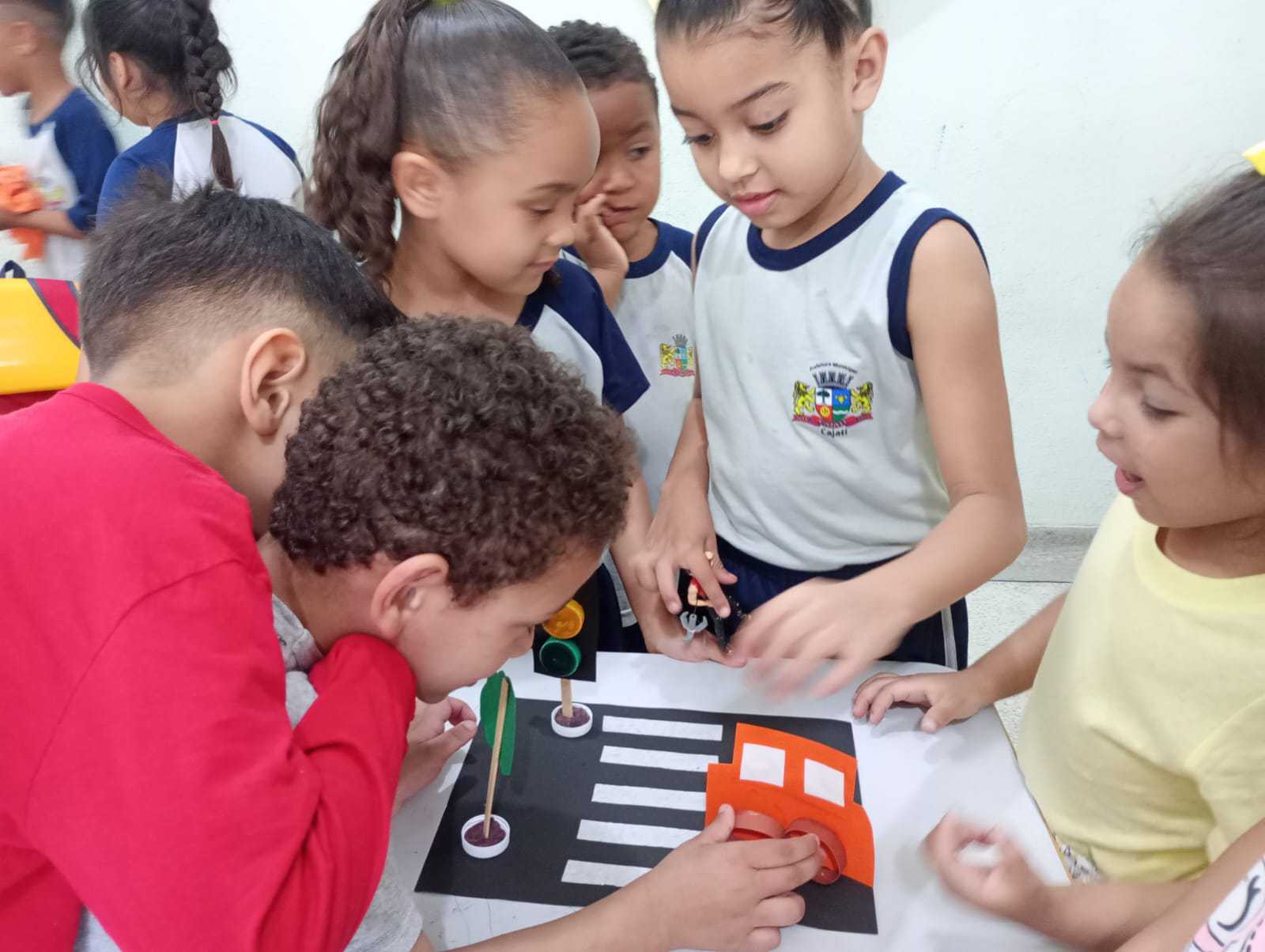 Os alunos da Educação Infantil da Escola Anna Maria Chaves participaram de atividades sobre conscientização do trânsito seguro. Assistiram a vídeos, ouviram historinhas e construíram maquetes que representam o trânsito.