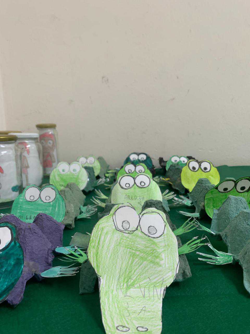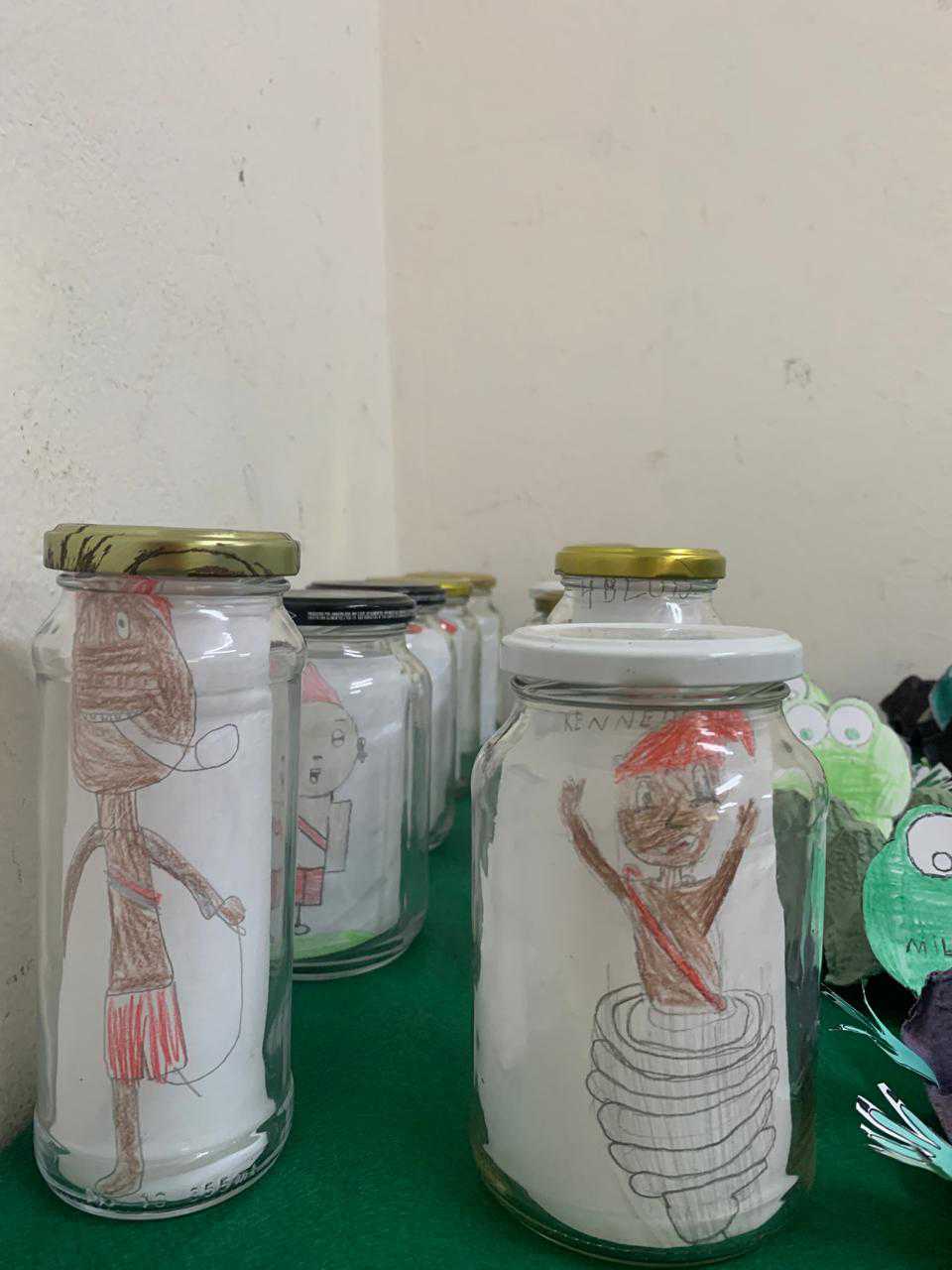 Os alunos confeccionaram a personagem Saci utilizando potes de vidro como base para a atividade. A proposta teve como objetivo trabalhar elementos da cultura popular brasileira, além de incentivar a criatividade, a coordenação motora e a reutilização de materiais recicláveis.
