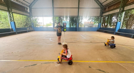 Simulado de trânsito com velotrol Foi montado um circuito com: Placas de trânsito, Sinalizações, Faixa de pedestre, Mini-semaforo, Percurso utilizando o velotrol. As crianças praticaram comportamentos corretos como parar, seguir, atravessar na faixa e respeitar placas.