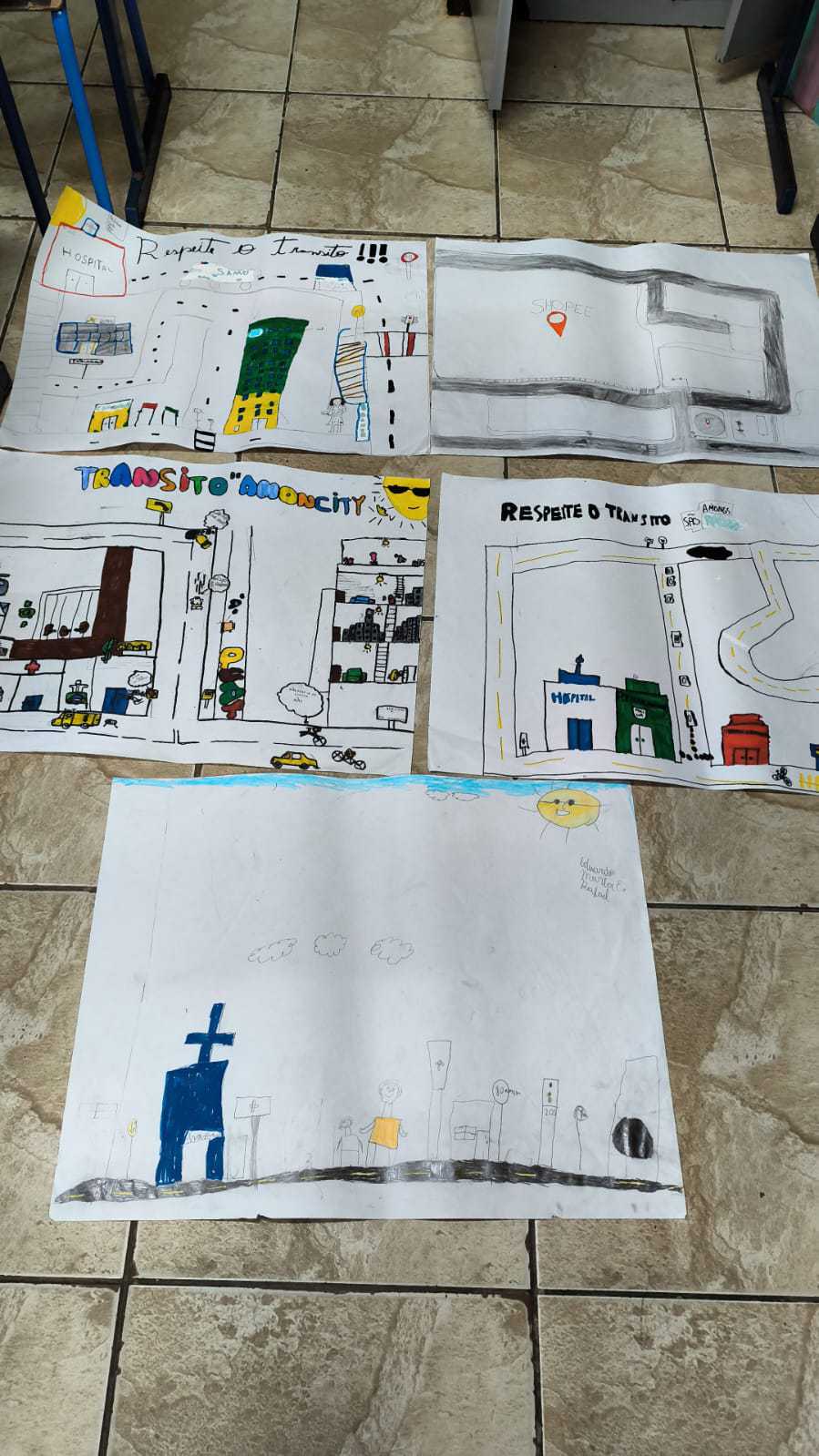 Os alunos realizaram atividades sobre conscientização no trânsito, representando por meio de desenhos a importância de respeitar as regras, as sinalizações e cuidar da segurança de todos nas ruas.