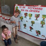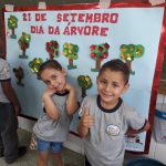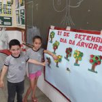 No dia 20 de setembro foi feita uma colagem formando uma árvore utilizando papel cartão e cartolina. Conversamos sobre a importância das árvores para nossa vida. Elas nos oferecem alimento, oxigênio. Sem as árvores não conseguiremos viver neste planeta. Falamos também sobre a natureza, florestas, plantas e animais que vivem nelas.