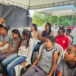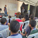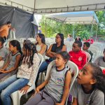 Ao chegar no local para palestra, alunos sentaram para iniciar a palestra que falou sobre a importância das ações práticas para a preservação do meio ambiente, introduzindo o conceito de sustentabilidade e como ele se relaciona com a vida cotidiana.