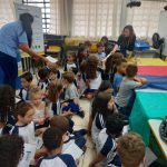 Foi realizada uma palestra para os alunos com demonstração de um simulador de erosão, apresentação do Tratamento de água e esgoto, a importância da coleta seletiva de lixo e o tratamento do óleo vegetal.