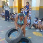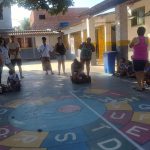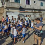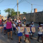 Dando continuidade as propostas elaboradas, realizamos a gincana: dengue – a luta é de todos nós – onde as professoras integradoras organizaram, duas equipes com os responsáveis presentes para realizarem a seguinte sequência de propostas: ao sinal das professoras, dois responsáveis de cada equipe sairam correndo para catar os diversos tipos de lixo que estavam espalhados pelo pátio da escola e colocá-los dentro de um saco de lixo. Depois, mais dois responsáveis de cada equipe, pegaram um pneu cada um e tirarem toda água de dentro dele. Quando acabaram a próxima dupla de cada equipe precisou tampar todas as garrafas e potes que encontraram abertos e, por fim a última dupla pegou os diversos vasinhos de plantas, tirou a água e colocou areia dentro. Ganhou a equipe que concluiu primeiro. Na sequência da execução desse planejamento sobre a dengue realizamos juntamente com o apoio da equipe gestora, a passeata unidos contra a dengue com todos os alunos da escola caminhando pelas ruas do bairro, distribuíndo um folder educativo sobre os cuidados que devemos ter para evitarmos a dengue. E para finalizar brincamos pique cola do mosquitão, onde a professora escolheu um aluno da turma por vez para ser o mosquitão, e o mesmo foi caracterizado de mosquito. Ao sinal da professora, os demais alunos da turma sairam correndo pelo pátio para evitarem de serem picados pelo mosquitão. Todos os alunos que foram picados ( tocados) pelo mosquitão ficaram sentados aguardando. A brincadeira acabou quando todos os alunos foram pegos e o próximo mosquitão, foi o último aluno que foi tocado.