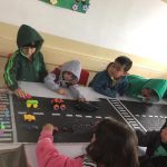 Conforme pedido antecipadamente, os alunos trouxeram de casa objetos relacionados ao trânsito: bonecos, carros, caminhões e motos, para montarmos a nossa rua.
