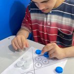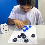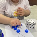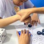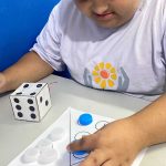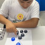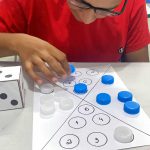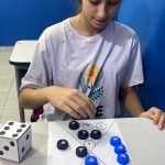 Cada educando recebeu um dado e jogou para descobrir a quantidade que saiu. Em seguida, observaram atentamente o papel com os espaços indicados e colocaram a tampinhas de garrafas na quantidade correta, realizando o pareamento, e correspondendo ao número indicado.