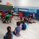 Desenvolvimento: a princípio os alunos tiveram uma aula para aprenderem  ou recordarem o que é uma paródia, e como hoje em dia os diferentes ritmos musicais e informações estão difundidos. Não foi muito difícil que os mesmos se apropriassem do assunto e de pronto se entusiasmassem com a ideia. Escolhemos uma música que fizesse parte da lista das mais conhecidas deles (Eu Era – Marcos e Belutti). Após isso, chegou a hora de irmos para a lousa e pensarmos na letra e rimas com o auxílio de todos, para que no fim todos cantássemos juntos.