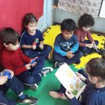 Para compreender as partes das plantas e suas funções, inicialmente foi contada a história: “O girassol feliz”. Em seguida os alunos do Pré II A falaram sobre as partes das plantas, enquanto a professora explicava a função de cada uma. Após essa compreensão foi confeccionado um painel com o girassol da história.