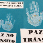 O trânsito é o espaço onde acontece o movimento de pessoas, de veículos e de animais. E, que pode ser tanto em ruas quanto em estradas. O trânsito é um espaço coletivo, ou seja, é um local onde as pessoas podem conviver e se comunicar. No trânsito, todos têm direitos e deveres. Por isso, é necessário, que haja respeito e compreensão entre todos que participam do trânsito. Crianças não são motoristas, mas isso de forma alguma as exclui como personagens do trânsito. Elas são pedestres, passageiras, ciclistas, o que reforça a importância de incluí-las na pauta sobre a educação no trânsito. A criança educada para o trânsito colabora para a proteção de si mesma e dos outros, além de se tornar um adolescente e, depois, um adulto mais cuidadoso. E principalmente cauteloso com sua vida e com a vida do próximo. Atividade lúdica do pombo representando a paz feita pelas mãozinhas das crianças.
