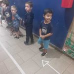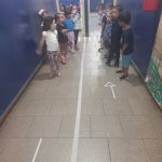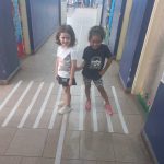 Fizemos uma simulação no corredor da escola com sinalização, faixas de pedestres e setas indicando como devemos nos comportar no trânsito.