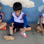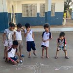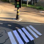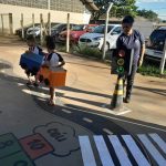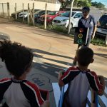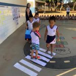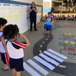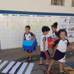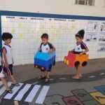 Através de um protótipo de uma via feita pelas professoras, foi orientado aos alunos identificar as cores do semáforo e o significado de cada uma delas, indicação da faixa de pedestres e os cuidados na hora de atravessá-la e a atenção aos veículos que possam circular pelas vias.