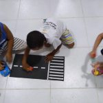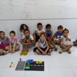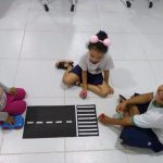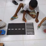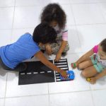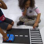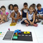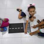 Os alunos trouxeram bonecas, carros e motos de brinquedo para simular o dia a dia no trânsito, utilizando a pista e o semáforo confeccionados.
