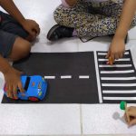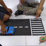 Confecção de pista feita de EVA e fita dupla face, semáforo feito com palito de picolé e tampas de garrafa;