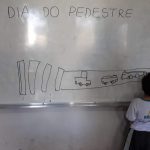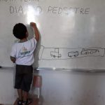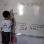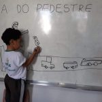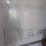 Desenvolvimento: Realizamos uma roda de conversa informal sobre a importância da segurança no trânsito, em seguida fomos assistir video onde retratava situações no trânsito envolvendo pedestre, de maneira lúdica com a pista de EVA, simulação da faixa de pedestre envolvendo bonecos e faixa e carrinhos de brinquedo, depois fomos para sala onde relataram situações no trânsito e sugeri desenho dirigido no quadro para melhor representar o aprendizado adquirido durante esta aula, com diferentes meios de informação.