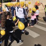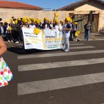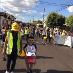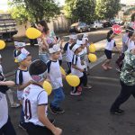 Em seguida, os alunos e toda a comunidade escolar participaram de uma passeata em entorno da escola e durante o percurso os alunos distribuíram panfletos com dicas para um trânsito seguro.