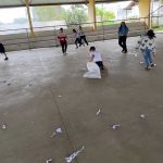 Esta atividade foi realizada com os 18 alunos do 5º ano, onde alguns alunos são escolhidos como pegadores (poluidores), enquanto os demais são os coletores de lixo. Pelo espaço da quadra ou pátio são espalhados papéis amassados ou bolinhas de papel, representando o lixo.
