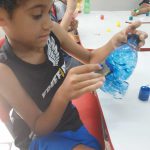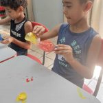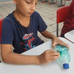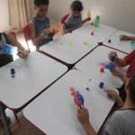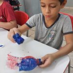 Iniciamos a aula com uma conversa sobre a poluição dos oceanos e a importância da reciclagem. Em seguida, confeccionamos os peixinhos a partir de garrafas plásticas. Cada aluno recebeu uma garrafa e foi orientado a decorá-la com tintas, criando peixes personalizados.