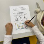 A seguir, foi solicitado que a turma observasse duas cenas na atividade e identificasse qual mostrava uma atitude ruim para o meio ambiente. Rapidamente, identificaram que a atitude ruim era aquela em que o lixo foi jogado no chão e não no lixo.